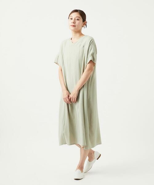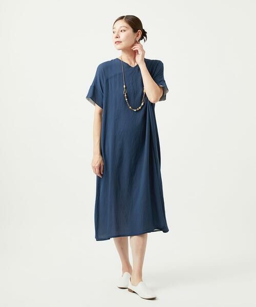 Vネックデザインの1枚着ワンピース。リバーシブル仕立てです。前身頃の斜めの切り替えや後身頃のヨーク切り替えがポイント。後衿部分にはゴムを入れてストレッチを利かせ、着脱しやすく仕上げています。少し落とし気味のショルダーデザインで、リラクシーな雰囲気に。