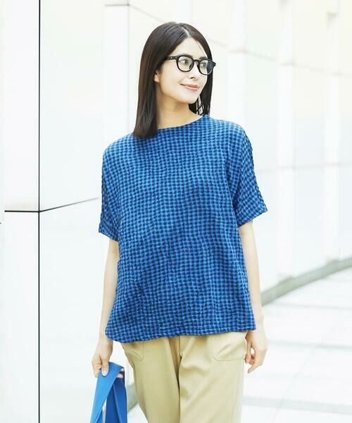 さらりとした着心地と表情のある素材感にのせたギンガムチェックプリントは、1枚で様になるデザイン。どんなボトムともしっくりとお楽しみいただけます。前身ごろをボトムインしたスタリングもおすすめ。軽くて涼しく、旅先にも重宝します。同デザインでドット柄[NGKHC72210]もございます。