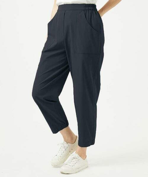 梅雨時に活躍する、撥水加工したパンツ。前から見るとテーパードシルエットですが、雨をしのぎやすいように後ろ側の裾部分をゴム仕様にしました。ウエスト部分はゴム仕様で、ファスナー開きのない履きこみタイプとなっています。前のステッチが入った大きなポケットと、後ろのパッチポケットがデザインポイント。