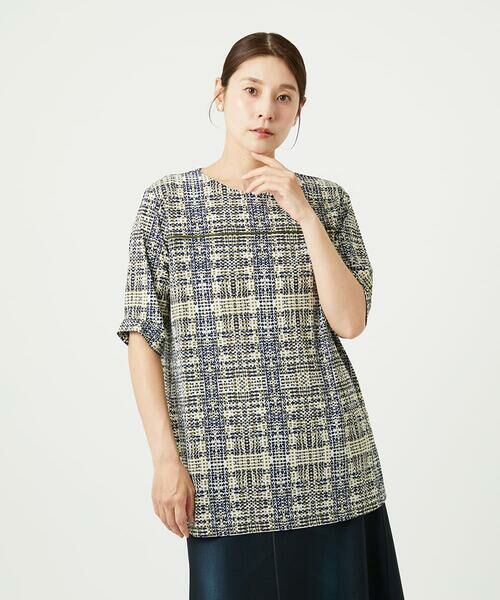 チェック柄が印象的なチュニック丈デザイン。ゆったりとしたシルエットで風はらんで涼しく着られます。落ち感のある素材なので、ゆったりながらすっきり見えします。胸元にコードをいれてアクセントをつけることできちんと感のあるデザインに仕上げました。