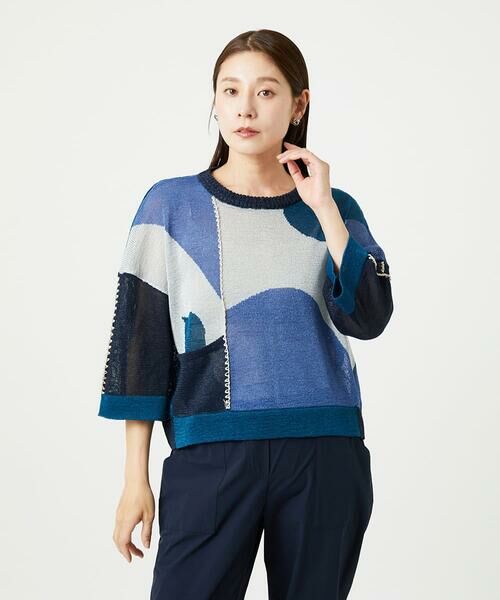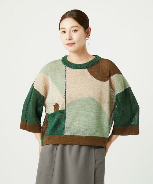 ドライタッチな生地感にインターシャで柄を表現したプルオーバーニットです。ハンドステッチ風のディティールがポイントで、シャリ感のある生地とほどよいシアー感、ゆったりとしたシルエットが夏にぴったり。ポケットから小鳥がのぞいているさりげないかわいらしさも特徴的。