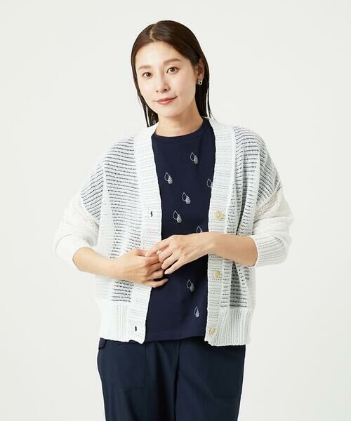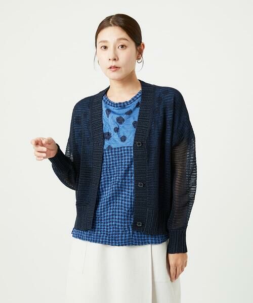 インナーにはシンプルに無地物を合わせたり、透け感を生かして色柄物をレイヤードしたり、日常でサッと着合わせていただける便利なカーディガンです。日よけや冷房対策としてもおすすめ。同素材を使用したプルオバーニット[NGFHA10260]もございます。