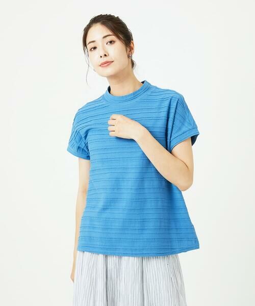 汗ばむ季節にうれしいコットン100%のタックボーダー素材を使ったカットソーです。肩が隠れる程度のドルマンスリーブに、首元はさりげないスタンドカラーできちんと感も。ゆったりとしたシルエットながら、すっきりと着ていただける1枚です。発色のいいカラーリングが夏空に映え、気分も明るくしてくれること間違いなし。