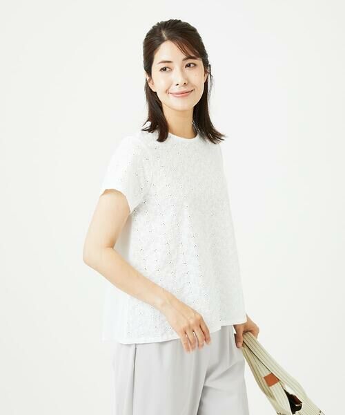 前身頃と袖は、トライアングルの刺繍を施した繊細なコットン素材を使用し、後ろ身頃はカットソー素材を使い着用しやすく仕上げました。ほどよいフレアシルエットで、腰回りの気になる部分をカバーしてくれるデザインもポイントです。バックネックは涙開きにして、フェミニンな印象で抜け感のあるデザインに仕上げました。