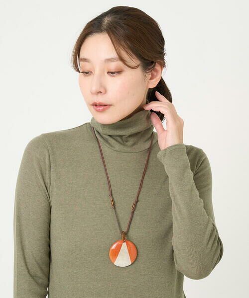 ココウッドに砕いたトウモロコシの皮とガラスでつくったワントップネックレスです。しっかりと厚みのあるワントップは、今の時期から夏にも映えるオレンジとグリーンのアクセントカラ—。コーディネートを引き締めます。※紐の長さは調節可能です※アクセサリーパーツ・部品などの金属部分に鉛が含まれている場合があります。小さなお子様が口に入れたり誤って飲み込んだりしないように、使用や保管の際は厳重にご注意ください。