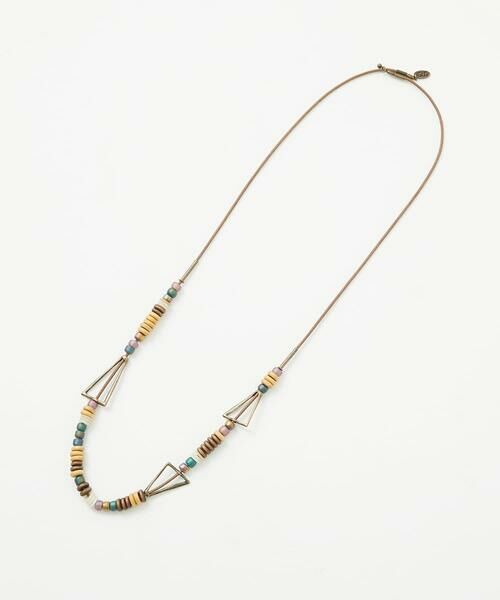 ナチュラル感のあるウッドビーズや光沢感を演出するガラスビーズを散りばめ、トライアングルモチーフがポイントのネックレスです。コーディネートを選ばず着用いただけるデザインで、ちょっとしたアクセントになってくれる使い勝手の良いアイテムです。※紐の長さは調節可能です※アクセサリーパーツ・部品などの金属部分に鉛が含まれている場合があります。小さなお子様が口に入れたり誤って飲み込んだりしないように、使用や保管の際は厳重にご注意ください。※自然光・照明の関係、パソコン・スマートフォンなどの環境により、実際と色味が違って見える場合がございます。予めご了承ください。商品の色味は、詳細画像をご参照ください。