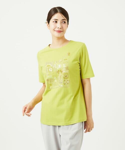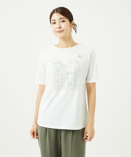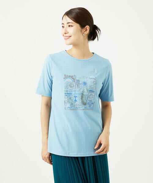 さらっとして夏に着やすい定番素材のクールローレルスカイコットに、光沢のあるスパンコールと刺繍をあしらったカットソー。前身頃にはナスカの地上絵のようなデザインと、さりげないジャンニロのロゴが刺繍がされています。程良い袖丈と着丈で、使いやすいシンプルなシルエットに。夏のおしゃれTシャツとして活躍間違いなしです。