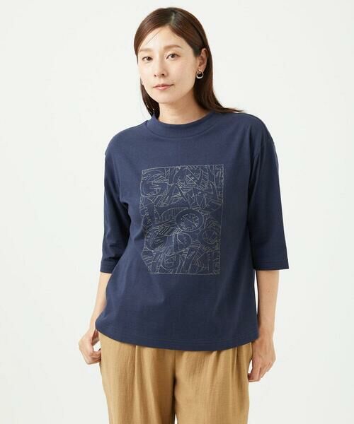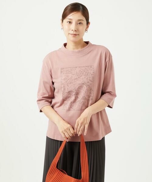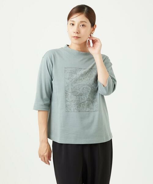 刺繍デザインがアクセントになったコットンカットソーです。リーフ柄の中にジャンニロの文字をあしらったデザインがポイント。ボトルネックに切り替えを入れて安定感のある衿に仕上げました。身頃はゆったりシルエットで動きやすいサイズ感に。長めの6分袖でやや袖幅を広くし、夏から秋にかけて使いやすいアイテムです。