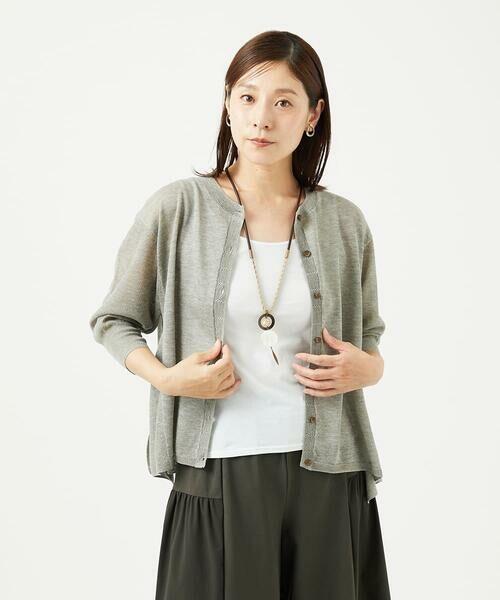 繊細な編地とデザインディティールが上質感溢れるカーディガンは1枚着でさらりときても全体のコーデがしまって上品見えするスタイリングに仕上がります。同素材のベスト[NGFJB10230]と合わせてアンサンブルで着るのもおすすめ。パールのネックレスやプチスカーフなどを合わせて、ちょっとしたフォーマルなシーンでも様になる1枚です。