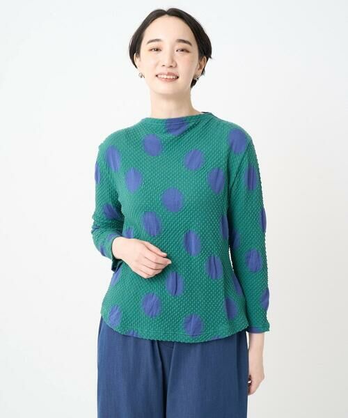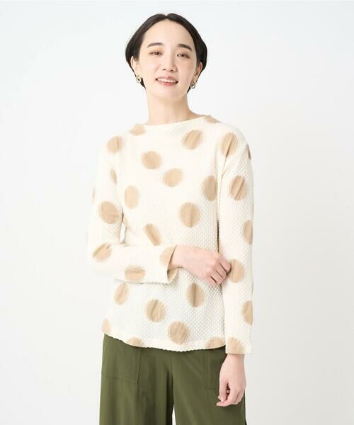 ボトルネック衿にラウンド型の裾ラインは、ジャンニロ人気の定番型のデザインです。素材の表情にマッチした楽しいドット柄デザインに仕上げました。
