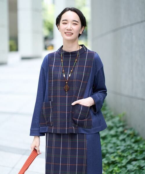 異素材使い部分がデニム調カットソーなので、大人カジュアルなスタイリングに決まるプルオーバー。チェック柄がきちんと感もあり、抜け感のあるスタイリングに仕上がります。どんなボトムとも高相性。同素材のスカート[NGHJB22360]を合わせたセットアップがおすすめ。こなれ感のあるお出かけ着に仕上がります。