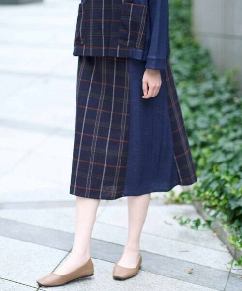 ウエストゴムの履きこみタイプスカート。身頃中心前後にはガーゼ調先染めチェックの布帛素材を使用し、両サイドにはなめらかで履き心地もストレスフリーなリバージャージーを異素材使いしてデザインポイントにしています。