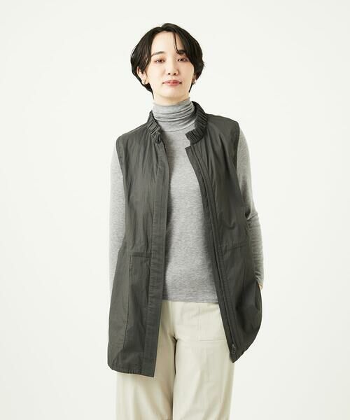 人気のベストが秋冬カラーで仕様をを変えて再登場! 軽さのあるナイロン素材を使ったロングベスト。衿はギャザーを入れてソフトな印象に仕上げました。ウエストのストリングでシルエットの変化も楽しめます。アームホールと裾はゴムを入れて共布のパイピング始末から身体に沿うよう工夫しました。
