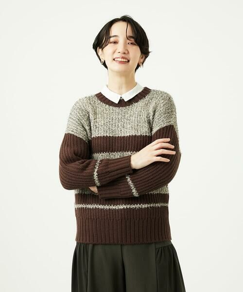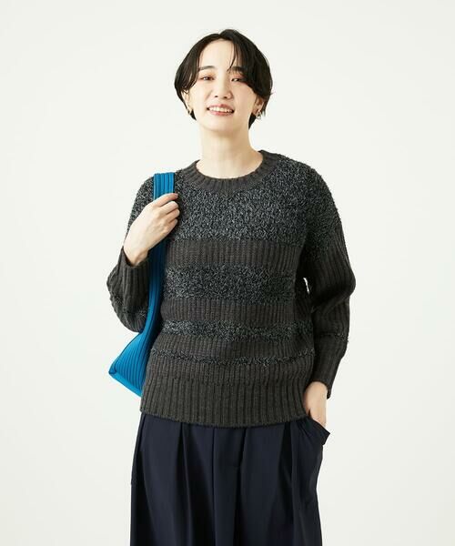 ボーダー柄に光沢感のあるインポートのフェザーヤーンを使用したトレンド感のあるニット。毛混のニットとの組み合わせから、素材の暖かさと柔らかさで季節を先取りしたデザインに仕上げました。ラメ感が上品で華やかな印象を与え、1枚で様になるボーダーニットです。