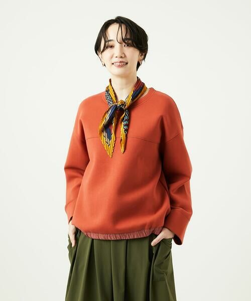 ダンボールニット素材をアスター加工と呼ばれる製品染めにて表現したトレーナー風カットソー。柔らかくスベスベした気持ちのいい肌触りです。裾には同色のタフタ素材でポイントを持たせ、やや絞ることでバランスの良いシルエットに仕上げました。胸元の切り替えデザインもさりげないポイントです。