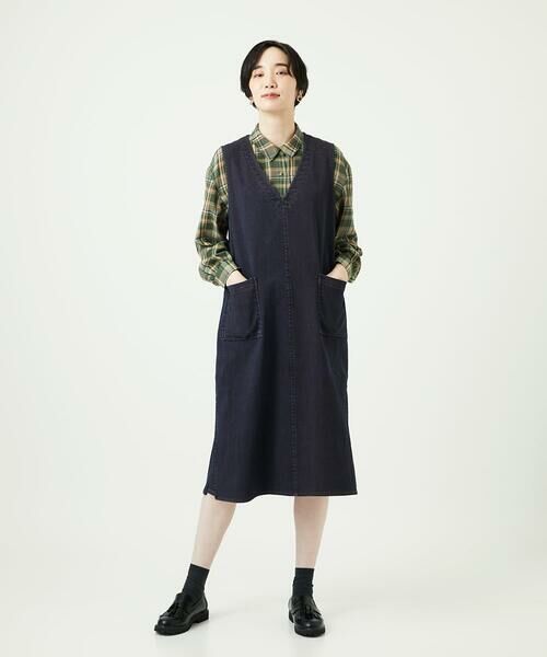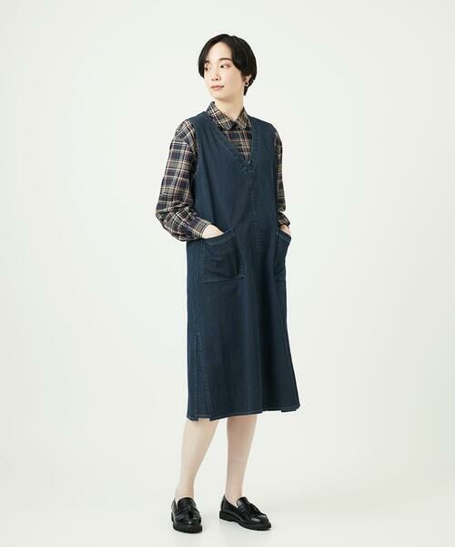 インディコ素材を使用したジャンバースカートです。Vネック衿と、きれいな縦ラインのロングナローシルエットが特徴。裾にスリットを入れ、デザインポイントと履きやすさを兼ね備えています。裏地の配色とアウトポケットがかわいらしいアクセント。