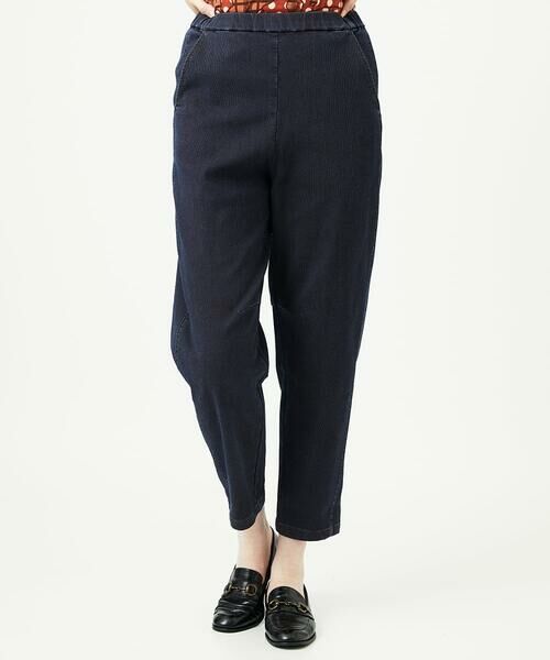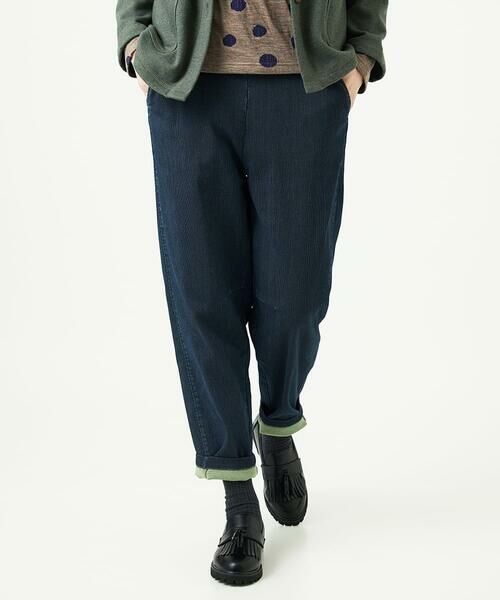 インディゴ素材を使用したパンツです。ややゆったりとしたシルエットで裾に向かってゆるやかにテーパードしたデザイン。ウエストは脇から後にかけてギャザー仕様でファスナー開きではないので履きやすさも魅力です。裏側の配色カラーを折り返して見せるとおしゃれの幅が広がります。