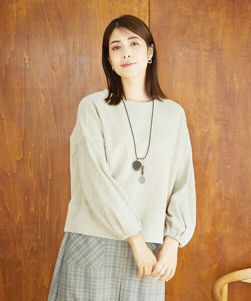 身頃と袖の切替デザインが特徴のカットソー。身頃には凹凸感のあるジャージ素材を、袖には再生ウールを縮絨したジャージ素材を使い合わせました。裾と首元の裏側にはバックサテン生地を縫い合わせ、安定感のある生地感に仕上げています。ギャザーを施しボリュームを持たせた袖がデザインポイント。