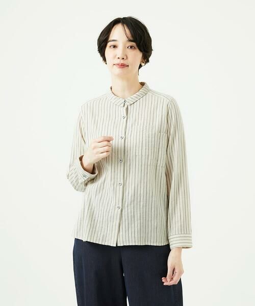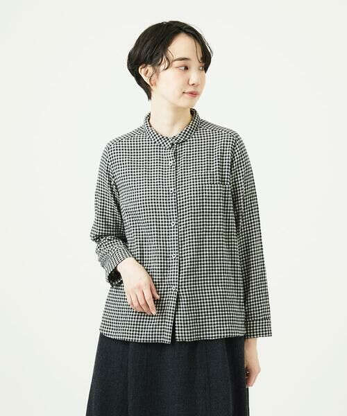 ジャンニロで定評のある小さめのシャツカラーで、ニットなどのインナーから羽織りとしても使用できる合わせやすいデザインを新しく起毛シャーリング素材で作りました。左胸のWポケットがアクセントとなっている可愛らしいカジュアルな印象のブラウスに仕上げています。