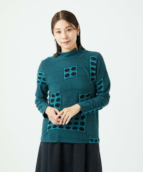 オーストラリア産メリノウールとリサイクルポリエステルで編んだジャガードジャージー素材です。編地は一重の部分と袋編みになっている部分があり、また、水溶性ビニロンを使用し生地を洗う時に溶け、ぽっかり穴が開いたようになります。さらに縮絨加工することで穴が広がらないように水玉を表現しました。表情豊かなオリジナリティー溢れる素材です。
