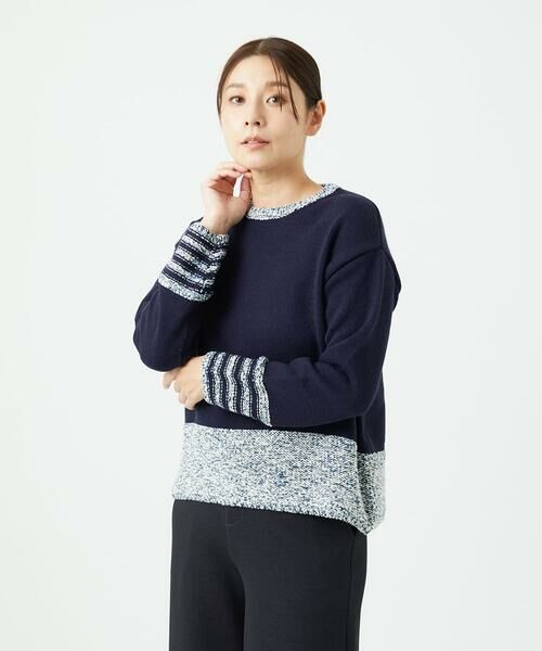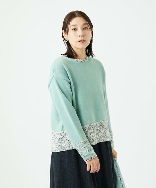無地部分は毛混のボリューム感のある素材を使用しています。カスリ調に見える糸は、リリアーンと呼ばれる特殊な意匠糸です。この2つを組み合わせて表情豊かなニットに仕上げました。