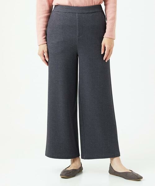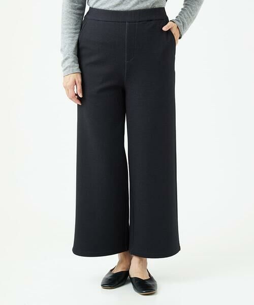 どんなトップスと合わせてもスタイリングが決まる、ややワイドシルエットの裏起毛パンツです。ウエストゴム仕様の履きこみタイプですが、前開き風に飾りステッチを施し、後ろにも飾りポケットでデザインを持たせました。前側にはポケットがしっかりついています。これから本格化する冬に向けて1枚持っていたいパンツです。