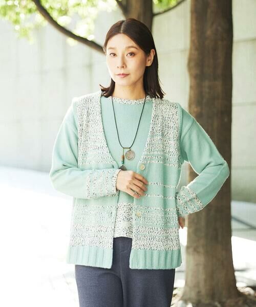 前身頃は無地のバルキー糸とカスリ調のリリアーン糸をパネルボーダーで編み立ました。後身頃は無地で仕上げています。アームホールと裾のリブ部分はリリアーン糸で配色にしてデザインポイントにしています。また、やや着丈を長くしています。ボタン止めの前開き仕様にすることで着脱しやすく仕立てています。