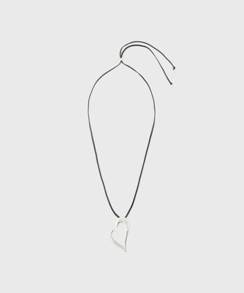 ハートモチーフのチャンキーなレザーネックレス。 可愛らしくなりすぎない、オリジナルで作成したハートのシルエットがポイントです。牛革の紐にメタリックな艶めきが可愛らしくなり過ぎず、大人っぽくモードな印象でお使いいただけます。※こちらのモデル着用画像はサンプル品を撮影しております。実際の商品と仕様、加工、サイズが若干異なる場合がございます。予めご了承くださいませ。
