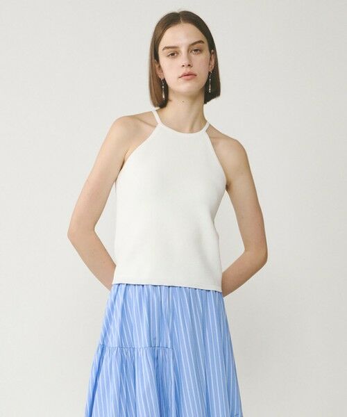 コットンブレンド糸で片畦編みしたホルターネックのキャミソール。肩から腕にかけてすっきり見えるラインに拘り、女性らしい華奢さを感じられるアメスリデザインに仕上げました。やや肉厚で透けを気にせず、また衿ぐりが詰まっている為一枚でヘルシーに着て頂けるのもポイント。お揃いでお作りしたカーディガンとのセットアップもおすすめです。