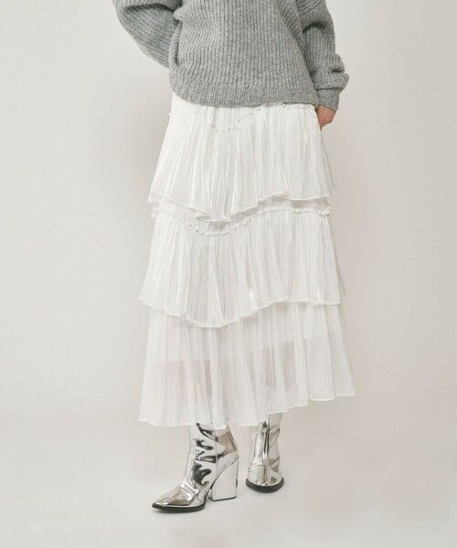 上品&華やかに着映える、主役級ティアードスカート。イレギュラーフリルで表現したロマンティックなロング丈や、用尺をたっぷりとった贅沢な分量感が歩いた時の美しい揺れ感を生み出し、スタイリングに映える特別な表情を纏います。楊柳の入った薄手の割繊素材は繊細なラメ感もあり、動きに合わせてゆらぐ姿がとっても軽やか。Tシャツやスニーカーなどを合わせても、素材の上質感や凝ったディテールがカジュアル見えせず、どこか大人な印象に見せてくれます。清涼感溢れるホワイトとシックで落ち着いた印象のブラウンの2色をご用意しました。