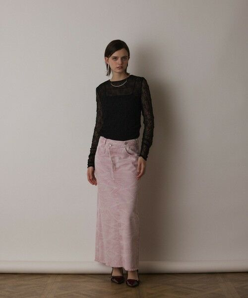 一枚で主役級の存在感を放つ、アシメトリーデザインのタイトスカート。 ピグメント染をした後に絞り風のケミカル加工を施した、新しい新鮮な表情がポイントのデザインです。フロントを合わせて通常通りに穿いていただくのはもちろんの事、 中心をあえてずらしてアシンメトリーな穿き方も綺麗に着て頂けるようパターンに拘りました。裾はフリンジを施してこなれ感をプラスし、バックにはスリットを入れて足捌きにも配慮。春の気分を纏うカラー展開をご用意しました。