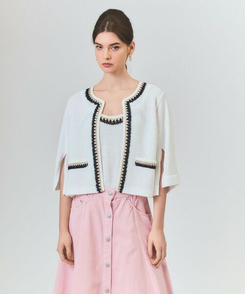 上質な素材で丁寧に編み立てた、ラグジュアリーなムード漂うニットカーディガン。ツィーディーなブークレ編のボディに、ラメ糸をきかせた手編みのかぎ針トリミングラインを効かせた、ほのかに漂うぬくもり感のある表情が魅力の一枚です。腕の動きが綺麗に見えるよう、袖にスリットを入れて涼やかに仕上げました。ワンピースにさらっと纏ったり、お揃いでお作りしたキャミソールとのアンサンブルスタイルもおすすめです。