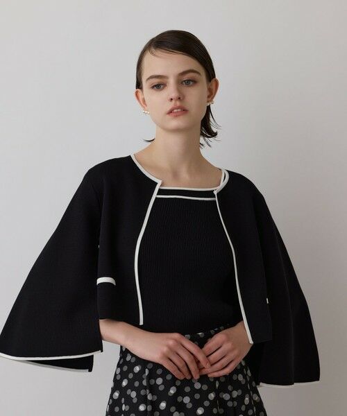 バイカラーのトリミングデザインがポイントになった、クラシカルな雰囲気薫るカーディガン。綺麗めな印象で羽織れるようミラノリブの編地を採用。美しい目面としっかりとした編地が特徴で、伸縮性が少なく型崩れしにくいのがポイントです。 羽織ると袖のスリットから腕が覗く女性らしい華奢さを感じられる、ケープスリーブのようなデザインがポイント。バランスの良い短めの丈感で、スタイルアップにもなる一枚です。お揃いのタンクトップと合わせたアンサンブルスタイルにすれば、セレモニーシーンやお食事会にもおすすめです。