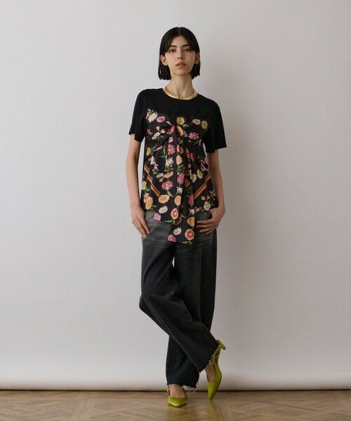 マルチカラーの華やかなフラワープリントが一際目を惹くレイヤード風トップス。無地のTシャツにスカーフを巻いたような、70年代のムード薫るディティールが魅力の一枚です。ヘムラインやドレープが綺麗にでるよう、パターンプリントで表現したオリジナル柄がポイント。繊細なタッチのフラワー柄や上品なカラーパレットにする事で可愛くなりすぎず、大人っぽく上品に着て頂けます。コーディネートに鮮度とトレンドをプラスしてくれる、今夏注目のアイテムです。