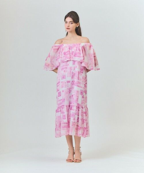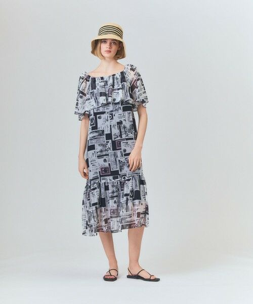 【Japan Fabric】夏のお出かけやリゾートシーンに着たくなる、シーズナブルなドレープフレアスリーブドレス。繊細で落ち感のきれいなシフォンジョーゼットを使用。そこにリゾートの絵葉書柄をグラフィカルにアレンジしたスタンププリントを優しくのせた、柔らかなニュアンスを感じられる一枚です。体を締め付けないゆったりとしたリラクシーなシルエットで、涼やかに着て頂けるのもポイント。肩を落としてオフショルダーとしてもご着用いただける2WAY仕様となっています。※こちらの画像はサンプル品を撮影しております。実際の商品と仕様、加工、サイズが若干異なる場合がございます。予めご了承くださいませ。洗濯表示洗濯不可 漂白不可 タンブル乾燥不可 アイロンは120℃まで 弱いドライクリーニング(石油系)可