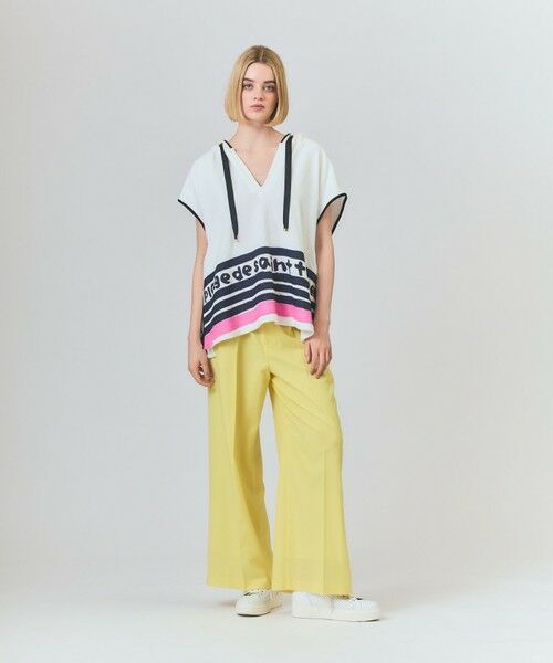 【Japan Fabric】 高級感あるコットン100%のミニループパイルを使用したポンチョフーディ。 大胆なボーダーと手描き風のレタードが日差しに映える一枚です。密度が濃く毛足の短いパイルに、あえて顔料を染みこませてしっかり染め、色鮮やかで夏らしいデザインに仕上げました。ゆったりとした身幅に大きなフードを添えて、リラックスした楽なシルエットに。水着の上からさっと纏うのはもちろん、いつものパンツやデニム、ロングスカート等あえてタウンユースに着て頂いても様になるアイテムです。