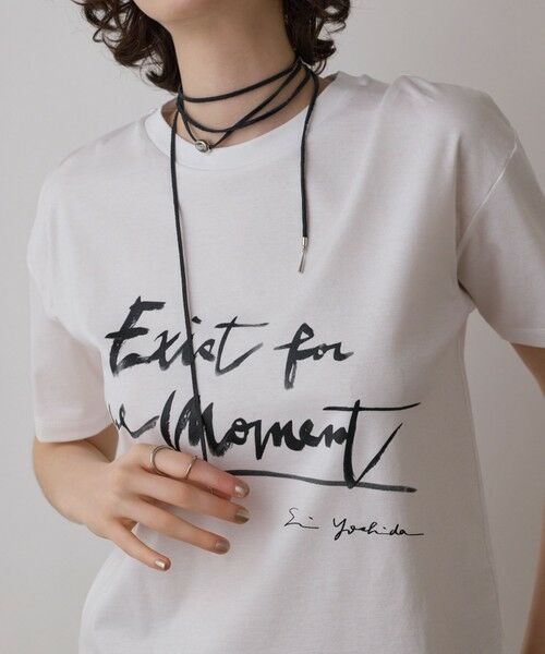 Diagramのために描き下ろした、ヨシダエリさんのテキストアートをプリントした T シャツ。表面が美しいジャパンメイドの綿100%カットソーを使用し、ラフすぎない大人の上質感を感じることができる一枚に仕上げました。型崩れしにくく肌触りも心地よい為、夏の汗ばむ季節にも着やすいのも魅力です。 オーバーサイズのシルエットを表現する為、オフショルダーのボディで作りながらも、女性の身体が美しく見えるように身幅を大きすぎないよう微調整。小柄な方もバラス良く着こなせ、パンツスタイルだけでなくフレアスカートにイン&ブラウジングしたりと女性らしいスタイリングも楽しめる一着です。