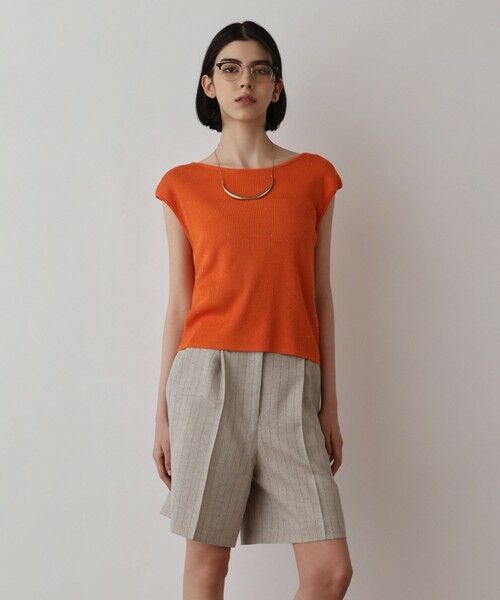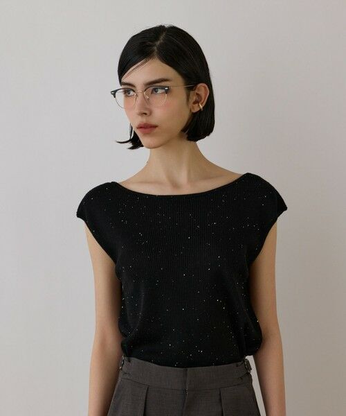 コーディネートが品よく華やぐ、2WAYスパンコールトップス。 レーヨンポリエステルのドライでリネンライクな糸を使用。そこに細かなスパンコールが編み込まれた、きらりと上品に煌めくリュクスなデザインです。さらっとしていて素肌でも肌触りが良いのもポイント。緩やかに肩を覆うフレンチスリーブのようなシルエットで、さりげなく二の腕をカバーしてくれるデザインに仕上げました。バックスタイルはやや深めの開きにオリジナルプレートをトッピング。お好みによって前後どちらでも使える2WAY仕様となっています。