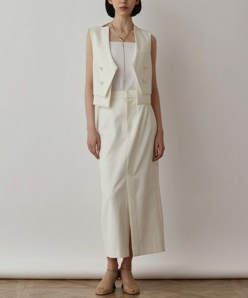 モードなディティールで魅せる、シンプルなノーカラージレ。夏場でもさらっと着て頂ける、ストレッチ性のあるドライタッチなオックス素材を使用。コンパクトなサイズ感でバランスが取りやすく、ノーカラーのスマートなデザインで幅広いアイテムと相性良く合わせて頂ける一枚です。裾はレイヤードディティールを取り入れ、肩にスリットを施して、Diagramらしいシャープな雰囲気をもった、今までにない新鮮なデザインに仕上げました。お揃いでお作りしたスカートとの大人なセットアップスタイルを楽しんだり、ゆったりとしたキャミワンピースにさらっと羽織って全体を引き締めたりと、様々な装いをお楽しみください。