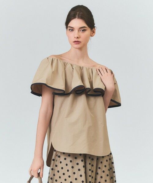 【Japan Fabric】 上品な光沢と張り感が綺麗なコットンポリエステル地でお作りした、ドラマティックな佇まいのラッフルブラウス。 贅沢な分量感を出したラッフルディティールが、女性らしい華やぎを演出します。