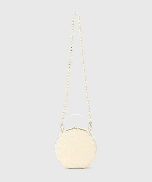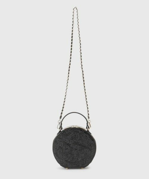 綺麗めな印象で持てるサークル型の2WAYバッグ。このバッグの為に描いた品のある柄がポイント。ファスナーを開けるとマチがあり、中が見やすく見た目よりもしっかり収納できるのも魅力。レザーを通したチェーンストラップを取り付ければ肩掛けも楽しめる、便利な2WAY仕様です。