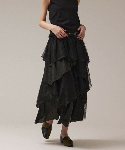 ロマンティックなムード漂う主役級ティアードスカート。落ち感のあるシアーサテンと繊細なレースをたっぷりと使った華やかな表情がポイント。用尺をたっぷりとった贅沢なボリューム感や、イレギュラーヘムで表現した優美なデザインが歩いた時の美しい動きを生み出し、スタイリングに映える特別な雰囲気を纏います。ウエストはゴム仕上げでストレスのない楽な穿き心地を実現しました。シンプルなTシャツを合わせるだけで、上質な素材の風合いや凝ったディテールがカジュアル見えせず、どこか華やぎのある印象に。より女性らしい雰囲気を纏えるキナリと大人の上品な装いに似合うブラックの2色をご用意しました。