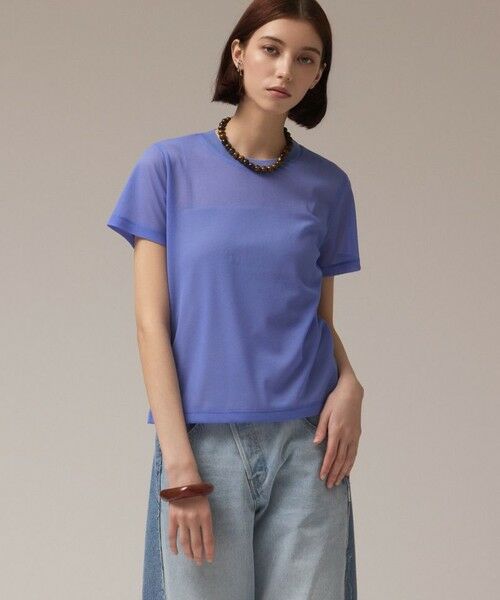 旬な素材でトレンドを呼び込む、シンプル&涼やかなトップス。昨年好評だったシアーT シャツを今季らしくリニューアルしてお作りしました。表面に程よいシボ感があるオーガンジートリコット素材を使用。昨年よりもストレッチ性に優れたジャパンメイドの素材を選び、袖丈や幅も調整して、より着心地良くアップデーとしています。衿ぐりはリブで編み立てているためヨレにくく、Tシャツながら高級感あるデザインに仕上がりに。 様々な装いに万能に似合うクルーネックに程よく体から離れる抜け感シルエットが、大人のカジュアルスタイルをワンランク上に格上げしてくれます。定番として重宝するブラックとホワイトに加え、夏の太陽に映えるブルーの3色をご用意しました。