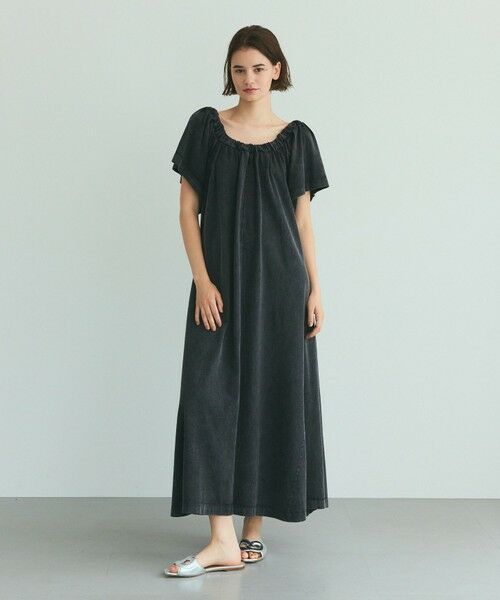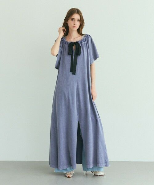 様々な着こなしを楽しめる、リラックス感のあるロングドレス。ソフトな風合いのコットン100%の天竺に、ピグメント染めとブリーチ加工を施してヴィンテージの風合いを美しく再現したデザイン。体から離れるゆったりとした開放感のある着心地に、深めのスリットを入れて女性らしい抜け感をプラスしました。首周りの大きなリボンで調整でき、オフショダースタイルでも着用できる嬉しいデザイン。さらに前後どちらでも着用でき、お好みによって気軽にイメージを変えてお召しいただけます。