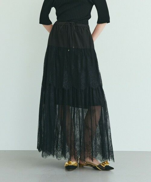 繊細で高級感溢れるレースをふんだんに使用した、ロマンティックな佇まいのロングスカート。薄手で清涼感があるドライタッチのトリアセシアーローン素材を使用し、レースを切り替えたリュクスなデザインの一品。裏地はあえて短めに設定して透け感&軽やかにし、裾はスカラップで処理した美しい仕様に仕上げました。歩いた時に美しい揺らぎがより一層女性らしく、華やかで高級感に溢れます。お揃いのジレを合わせることで、ワンランク上のセットアップスタイルをお楽しみいただけます。