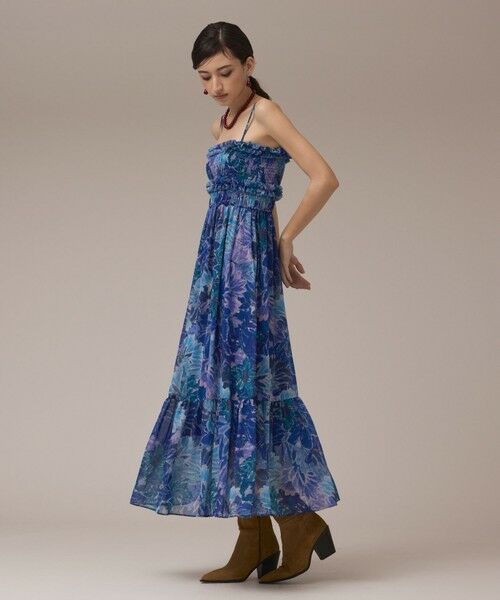 一枚で華やかに着映えるリゾートワンピース。薄手で軽い楊柳シフォンにのせた、美しいタイダイリーフ柄やカラーが一際目を惹く一枚です。 胸元にゴムシャーリングとちびフリルを施しほんのり甘いテクニックを入れて、ボーホーな雰囲気がありつつも女性らしく着て頂けるデザインに仕上げました。用尺を贅沢にとった存在感のあるロング丈に、ヘルシーな肌見せを楽しめる華奢な肩紐のコントラストも新鮮で、大人のシックなサマースタイルを楽しめます。ストレスのない楽な着心地も嬉しいポイントです。