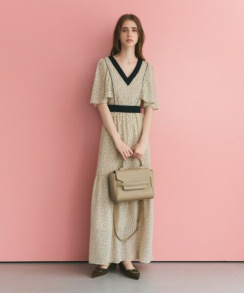 綺麗めなボヘミアンスタイルを楽しめる、70'sスタイルの一枚映えワンピース。ドレープ感が非常に綺麗にでる梨地ジョーゼットに、ヴィンテージの図案からおこしたオリジナルプリントをのせた美しい佇まいの一品です。手描き風のドットをバランス良くランダムに配置した、拘りが詰まったオリジナル生地を使用しています。ややハイウエストのフィット&フレアシルエットにゆったりとしたフレアスリーブ、そこにバックリボンをプラスして可憐なデザインに仕上げました。存在感溢れるロング丈ながらも深く開いたVネックで、女性らしい華奢さを演出。メタリックなトリミングラインを施す事で、甘すぎない大人な表情にしたのもポイントです。袖あり・膝下の上品なデザインは、お食事会やお呼ばれスタイルにぴったりです。※こちらのモデル着用画像はサンプル品を撮影しております。実際の商品と仕様、加工、サイズが若干異なる場合がございます。予めご了承くださいませ。