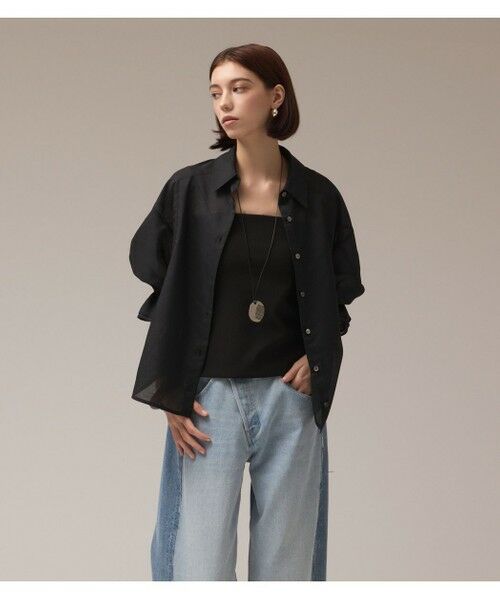 涼やかなシアーオーガン地でお作りしたドルマンスリーブシャツ。適度に美しく透ける素材が上品で、着こなしを大人っぽさのあるトレンドスタイルへと導いてくれます。身頃はコクーンシルエット、アームホールはイレギュラーな切り替えを施し、前後で着丈差を設けて、シンプルながらも動きのある一枚に仕上げました。袖口は二重のカフス仕立てて、たくし上げて軽やかに着て頂くのもおすすめ。前を留めて一枚着としてはもちろんの事、タンクトップやTシャツ等に合わせ前を開けてラフに羽織った着こなしもおすすめです。