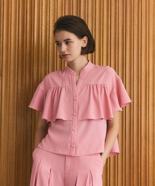 【Japan Fabric】一枚で華やかに映えるラッフルレイヤードブラウス。胸元にたっぷりとギャザーを寄せ、さりげないボリュームと動きを出した優雅なデザインがポイントです。サテンを裏面使いしたマットな風合いの生地で、なめらかな落ち感を表現。 そこに共布のくるみボタンが落ち着きのあるリッチな印象を醸します。 クロップド丈のバランスの良い着丈感で、お揃いでお作りしたワイドパンツと相性抜群。ボタンを開け、ボレロジャケットのように着ていただくのもおすすめです。