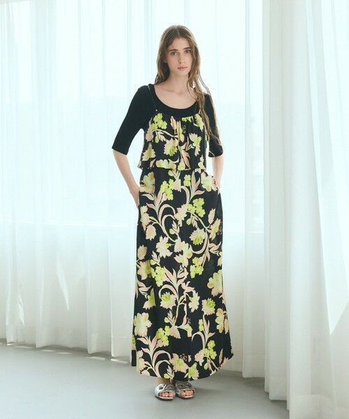 インポートならではの大胆で色鮮やかな生地でお作りした、華やかなマキシドレス。ラグジュアリーブランドのファブリックを数多く手がける、フランスの老舗テキスタイルメーカーDEVEAUX(デヴォー)社のリゾート感のあるプリント地を贅沢に使用。リネンのようなシボ感のある、レーヨン100%のナチュラルな風合いの生地にのせたシックなフラワー柄が、大人の装いに品よく溶け込みます。黒をベースに優しいピンクとグリーンが美しく調和していて、洗練感がありつつもモダンな印象に。胸元の開きはバックリボンで調節でき、緩めにしてカットソーや薄手のニットを中に添えたレイヤードスタイルもおすすめです。 胸元の二重のラッフルが可憐なアクセントになりつつ、さりげなく体系カバーにも◎リラックスした着心地ながらもすっきりスタイルアップになるシルエットもポイントです。夏のお出かけスタイルやリゾートシーンに着たくなる、シーズナブルな一着です。